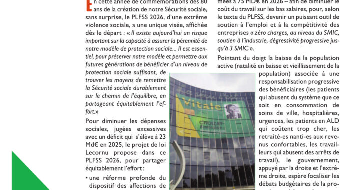 La commission Santé et Protection Sociale du PCF a publié un numéro spécial de son bulletin Globule Rouge, replaçant le débat sur le PLFSS dans la ligne du 80ème anniversaire de la Sécurité Sociale et d’un engagement pour un 100% Sécurité Sociale, une Sécurité Sociale du XXIème siècle, une nouvelle optique de financement et le principe de la gestion par les assurés, à rebours des orientations neoliberales.